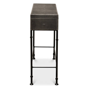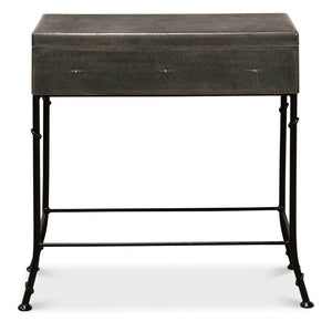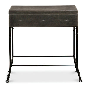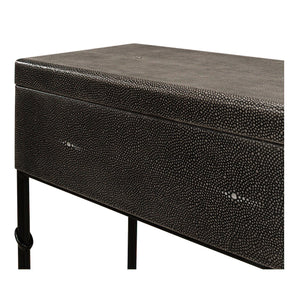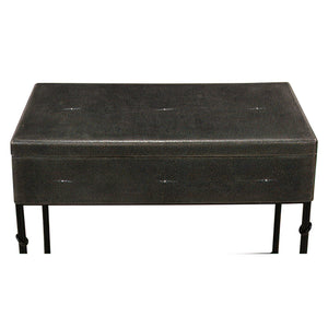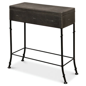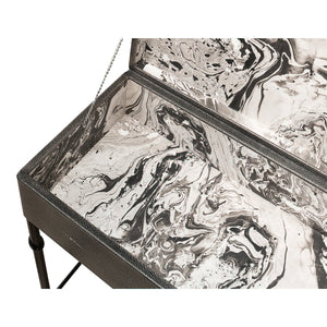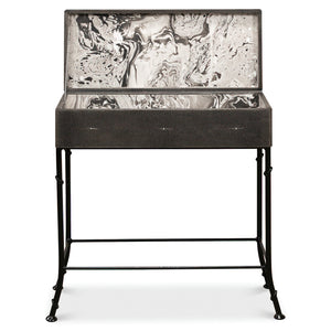 Embossed Leather Box on Stand, a shagreen embossed leather box on a forged metal stand. The box is covered in grey shagreen leather simulating real stingray shagreen. Marbleized paper decorates the interior of the hinged box which rests on a dark iron base.