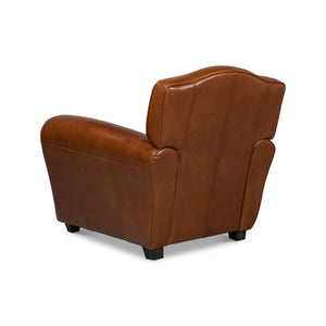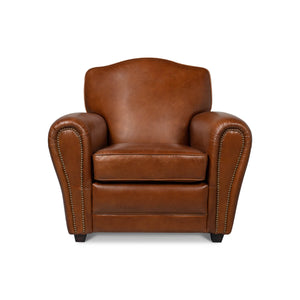 French Art Deco Style club chairs, upholstered with top-grain brown Vintage Havana Leather with a deep padded upholstered backrest and seat cushion, with boldly rolled arms and raised on square feet.