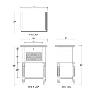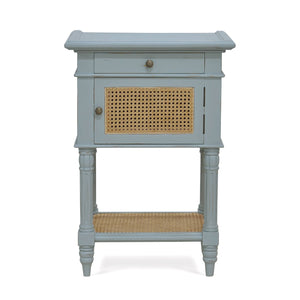 Introducing our French Provincial Blue Painted End Table with stylish caned cupboard panel. This exquisite piece combines timeless 18th-century French Provincial design with modern functionality. The lightly distressed Ocean Blue painted finish and intricate details make it a standout centerpiece that enhances any decor style.