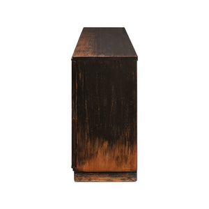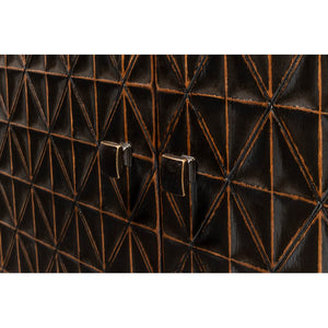 Geometric Appeal Rustic Pine Credenza, made with reclaimed pine, this four-door credenza has an intricate carved geometric pattern to the doors, in a vintage black hand-rubbed and distressed finish that allows the warm wood tones to show through.