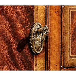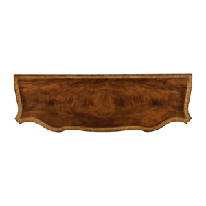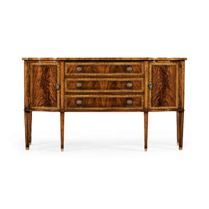 George III style crotch mahogany veneered serpentine sideboard. The breakfront with concave doors to either end and with three drawers to the center. Patinated brass oval handles, fine marquetry detail to the paneled tapered legs and set on brass feet with a square cross-section.