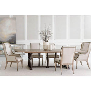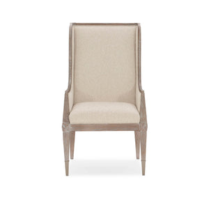 Highback Ash Modern Dining Armchair, a handsome addition at any table, the armchair elevates every dining experience. Its timeless silhouette is brought to life in a casually elegant Ash Driftwood finish and complemented with a finely tailored, luxe fabric cover in an elegant neutral shade. Easygoing at heart, the fine lines of this fully upholstered chair render it perfect for the host and hostess. Metal ferrules in Sundance Gold cap each front leg for a touch of bling.