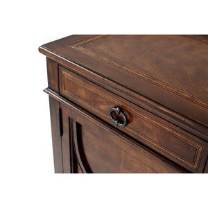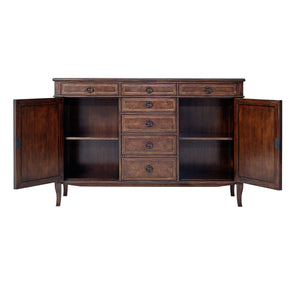 An Italian NeoClassic style mahogany sideboard, the rectangular crossbanded top above three short frieze drawers and four further short graduated drawers to the center flanked by two paneled cabinet doors with wavy 'X' applied decoration, each lockable and enclosing an adjustable shelf, on splayed legs.