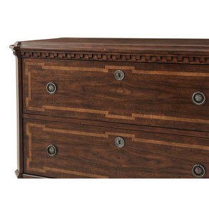 A European Louis XVI style commode with a molded edge top with canted corners, carved dental molding frieze above two long drawers with panel inlays, antiqued pewter handles and square tapered and inlaid legs.