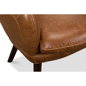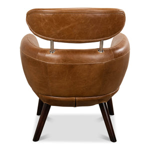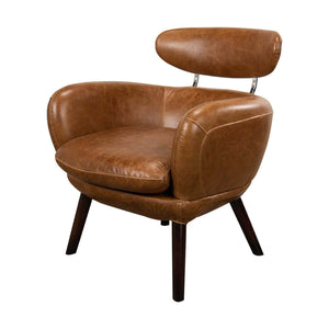 Mid Century Modern style leather upholstered armchair with a floating headrest, with vintage style aniline top grade brown leather with a tub back form, cushion seat and raised on splayed legs.