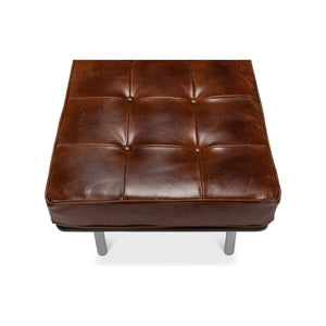 Mid Century style leather Bench with a top grain Havana brown boxed and tufted leather cushion seat on a simple stainless steel four-leg base.
