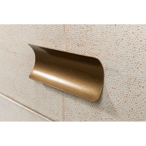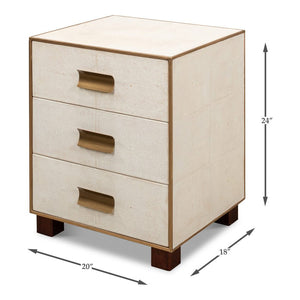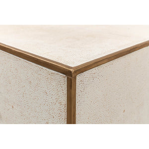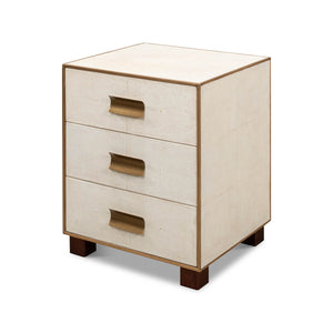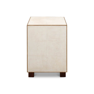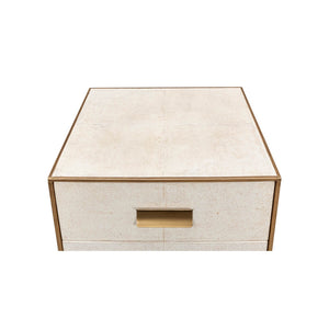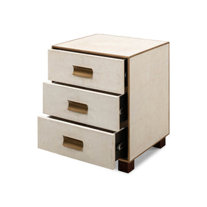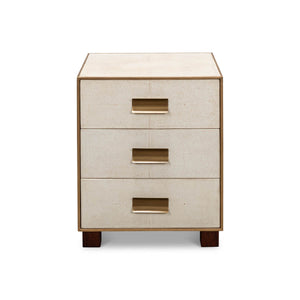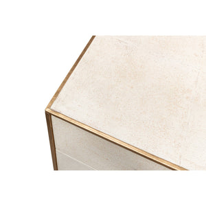 Mid Century Leather Side Table - wrapped in a faux shagreen leather in the osprey white leather. With gold highlights and trim, three drawers raised on short block feet.