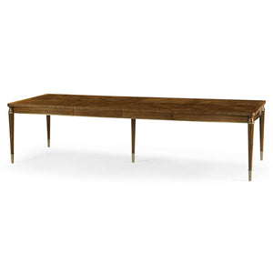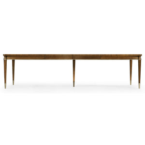 The rich walnut is beautifully complemented by brass hardware and trim, adding a touch of sophistication. The table's turned and tapered legs, adorned with brass caps, provide stability and a timeless aesthetic. Perfect for intimate dinners or larger gatherings, this extending dining table seamlessly blends style and practicality, making it a stunning centerpiece for any luxury dining room.