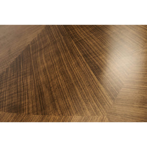 Elevate your dining experience with our Mid-Century Modern Extending Dining Table, a masterpiece of design and functionality. This exquisite table features a cross-banded and figured walnut veneer, artfully arranged in a book-matched pattern that evokes the meticulous elegance of straw work.