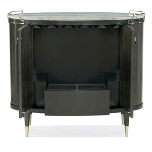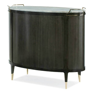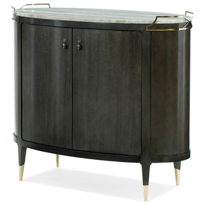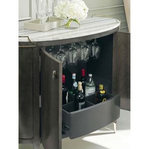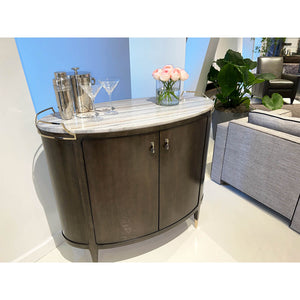 A Mid Century Modern oval bar cabinet with a striking sandstone top. The elegant top is trimmed with crisscrossing gold finish handles. This beautiful piece is finished all around and has two curved doors with custom metal pulls.