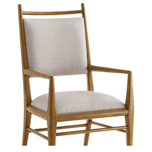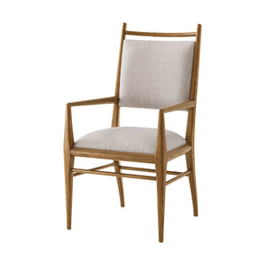 Mid Century style light oak dining armchair in our dawn finish, with a padded back and seat upholstered in performance linen fabric adds comfort and sophistication to this timeless design. Raised on tapered legs joined by a supportive stretcher.