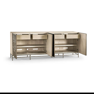 Modern Etched Brass Flowing Media Cabinet pairs bleached oak and metal and creates a stunning cabinet. The modern cabinet with age-old acid etched techniques on steel doors with an abstract flowing water motif in relief. Sitting atop delicate natural flared metal legs with a stretcher.