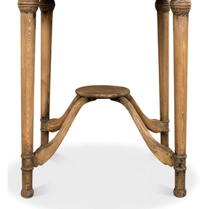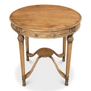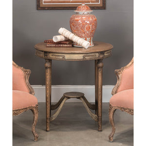 A rustic French country-style tea table. This table has an antiqued finish giving it the look and feel of a treasured heirloom. The round pine top has a warm brown finish and sits on a lovely curved stretcher base.