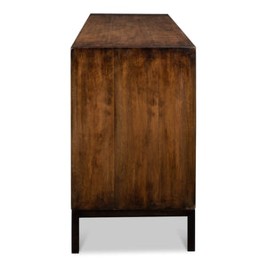 Crafted from high-quality pine and finished in a warm, rich brown hue, this sideboard offers both style and functionality. The two doors and three center drawers provide ample storage for all your living room essentials, while the metal base adds an extra touch of sophistication.