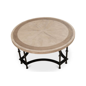 Every touch of the hand-applied wire brushing technique enhances the pine's grain, lending an organic texture that contrasts splendidly with the industrial grace of the metal base. Ideal for those who appreciate the balance of robust design and delicate detailing, the Modern Industrial Round Cocktail Table promises to be the focal point of any room it graces.