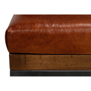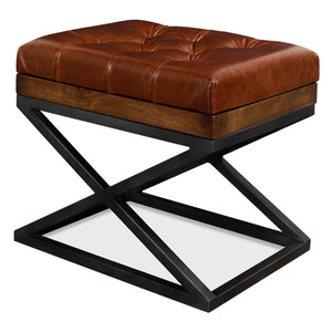 A modern tufted leather X frame stool, classic meets contemporary with this versatile piece. The top boxed cushion is crafted in rich brown leather accented with button tufting, it sits on an x shaped gunmetal frame. This piece is perfect to use as an ottoman or for extra seating.