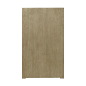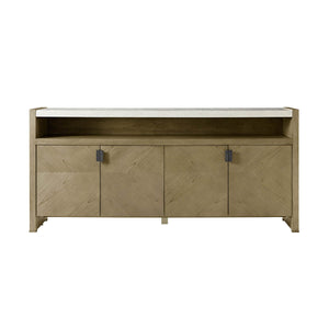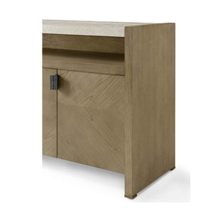 Modern Light Ash Media Cabinet, a four-door media cabinet in figured cathedral ash in an artful grain pattern in our light Dune finish. Completed with metal pulls in Ember and a top in our Mineral finish. Fitted with adjustable shelves in each cabinet.
