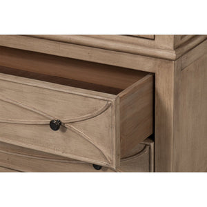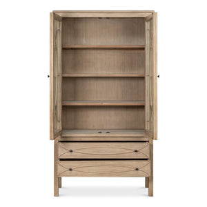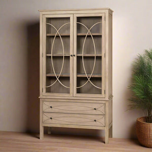 With geometric fretwork, two glass doors offer display for interior shelves, above two long drawers for additional concealed storage.