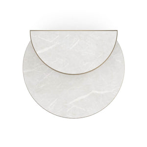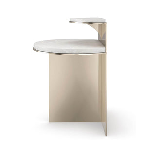 Modern Two Tier End Table, simple yet elegant with an emphasis on function, this curved end table adds depth and reflection to seating areas. Features two tiers of White Rhino stone atop an angular metal base finished in a Whisper of Gold. A standout on its own, even more memorable in pairs.