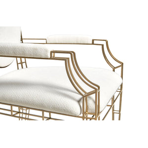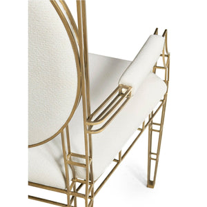 A warm bronze finish envelops the frame, adding a rich depth to the steel's natural sleekness and offering a visual warmth that complements any decor. The upholstered seat, back, and armrests are covered in a high-performance neutral fabric, which is both visually appealing and plush, providing a comfortable seating experience.
