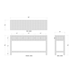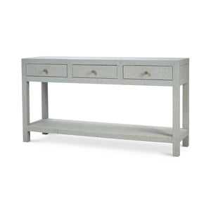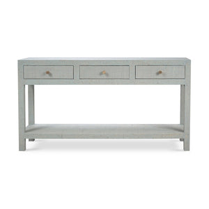 Upgrade your home with our Chic Pale Blue Washed Raffia Console Table. Wrapped in a pale blue washed raffia, this stunning table combines modern design with coastal charm. It features three spacious drawers for all your storage needs and an open lower shelf perfect for displaying your favorite decor items.