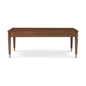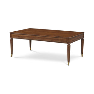 The Regency Style Rectangular Cocktail Table brings classical sophistication and architectural grace to the heart of any living space. Crafted in a warm walnut finish, its generously scaled top is accented with fine brass inlays, adding a subtle gleam to the richly figured wood grain.