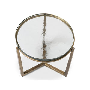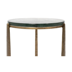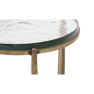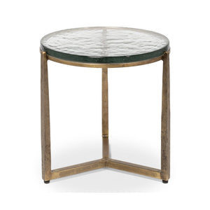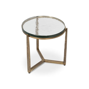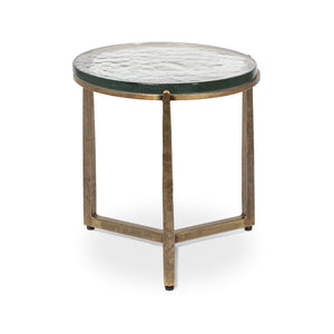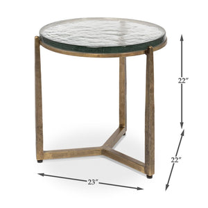 Elevate your living space with the Round Contemporary End Table - 23", a striking blend of artisanal craftsmanship and modern design. This exquisite piece features a hand-forged iron base in an aged brass finish, lending a touch of vintage elegance while maintaining a sleek contemporary aesthetic. The casted glass top, with its organic texture, adds depth and character, reflecting light beautifully to enhance any interior.