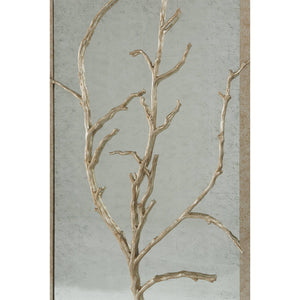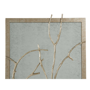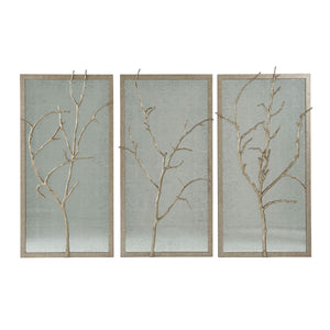 Add a touch of nature-inspired elegance to your walls with this Set of 3 Silvered Metal and Wood Wall Panels. Each panel features a delicately cast branch, artfully overlaid on an antiqued, hand-leafed mirrored background, creating a captivating interplay of light and texture. The silvered metal and wood frame provide a sleek yet rustic border, enhancing the organic beauty of the branches.