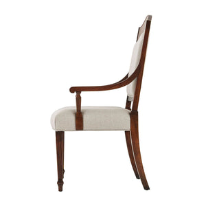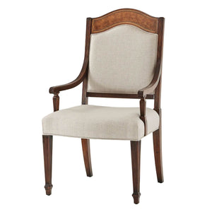 A fine mahogany, satinwood veneered and walnut burl veneered armchair, the arched toprail above a padded back enclosed by reeded uprights, scroll arms and uprights, the upholstered seat on square tapering and reeded legs with spade feet. Inspired by an 18th century original by Thomas Sheraton.