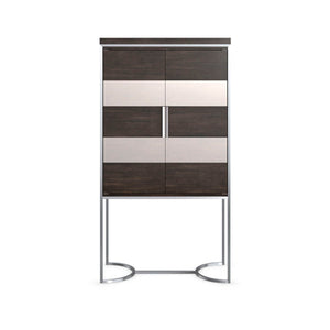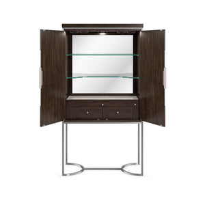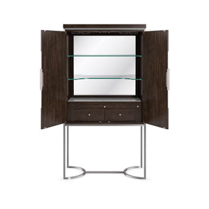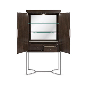 Smoked Modern Bar Cabinet, this architectural bar cabinet fuses form and function in an intriguing mix of materials and finishes. Its linear design adds height to a room, with a lavish amount of space for entertaining essentials. Features a mirrored back and lit interior with adjustable glass shelves, two drawers, a white marble work surface, and metal frame stemware storage. A pullout laminated shelf lets you serve guests with ease.