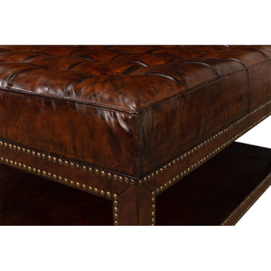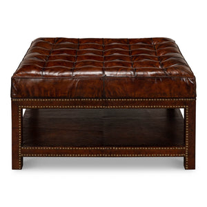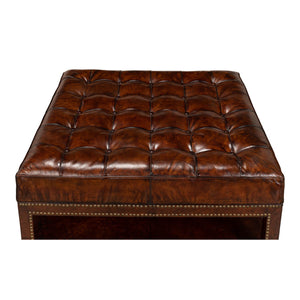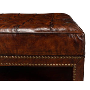 Vintage-style leather tufted ottoman in brown leather. It features a solid hardwood frame wrapped in rich brown leather detailed with nailhead brass trim. The cushioned top is fixed to the base with a tufted button pattern.