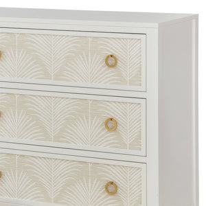 Showcasing refined coastal elegance, the White Palm Six Drawer Dresser features intricate palm frond patterns applied to the drawer fronts. The sophisticated design pairs crisp white painted wood with brass ring pulls, while tapered legs and clean lines create a graceful silhouette.