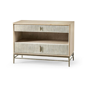 Wide Danish Cord Nightstand, replete with two Danish cord-wrapped drawer fronts adding style to the classic tone and feel of contemporary vision without shortcuts. A cast stainless steel base and hand-cast vertical hardware are finished in elegant satin white brass for a luxurious and sleek effect befitting refined and eclectic spaces.