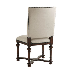 William and Mary Upholstered Dining Side Chair, this elegant dining chair is a superb example of the William and Mary style, known for its refined simplicity and structural harmony. The chair features a rectangular padded back and a plush upholstered seat that ensures comfort during prolonged dining experiences. The fabric’s neutral tone beautifully complements the rich, dark stain of the hand-carved wooden frame, adding a touch of timeless elegance to any dining setting.