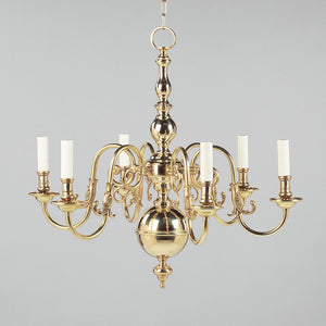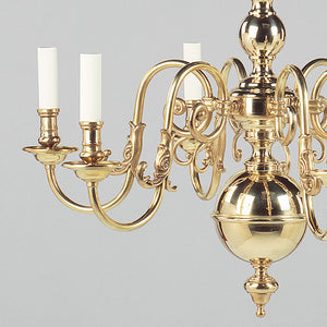This chandelier is inspired by a dutch antique. The central stem comprised of brass spheres complements the leaf-like decoration on the upward-curving arms.