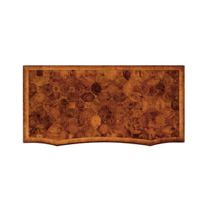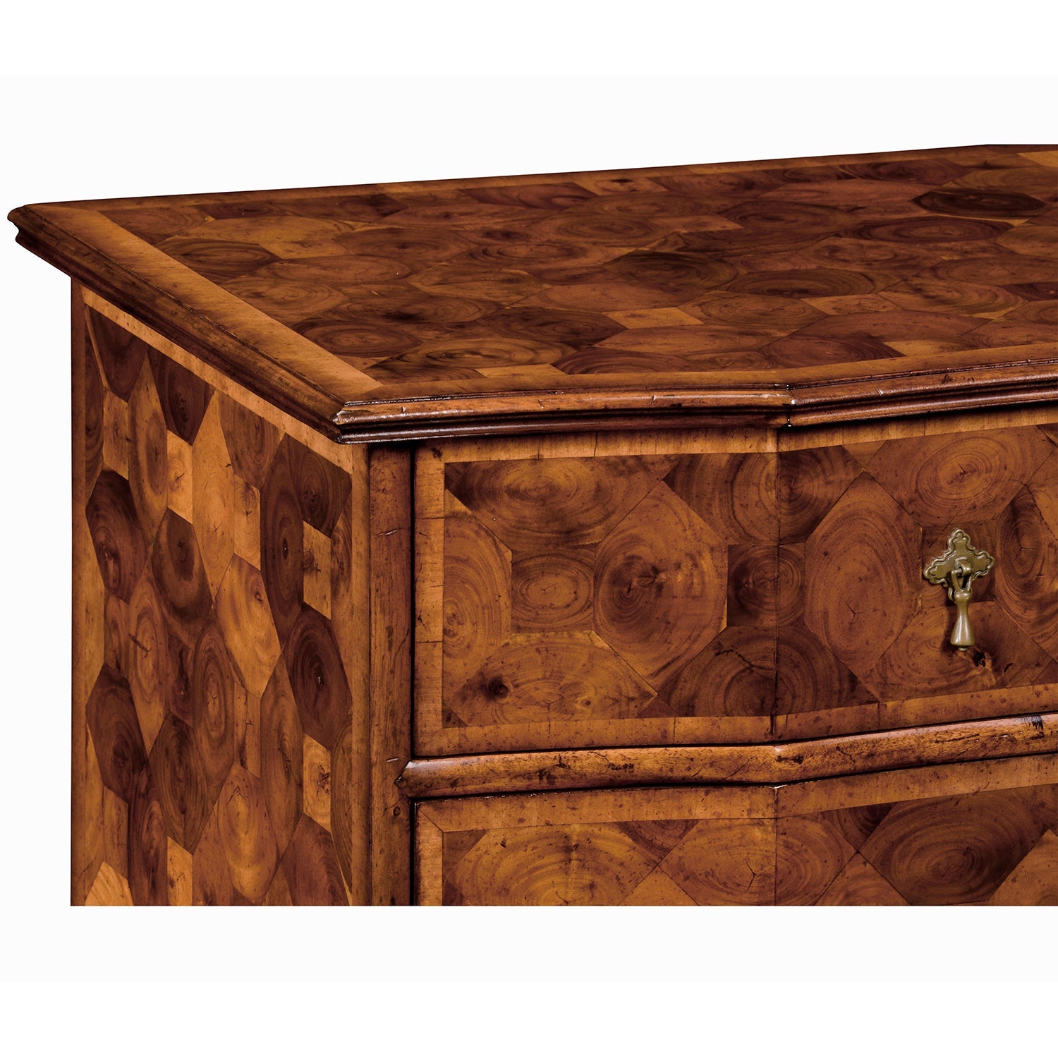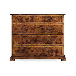 The English Oyster Veneer Chest of Drawers - William and Mary style pays tribute to late 17th-century English cabinetry. Its standout feature is the oyster veneer pattern, made from cross-cut wood sections arranged in hexagonal and circular shapes on the drawer fronts and sides. This creates a lively surface with depth and visual interest.