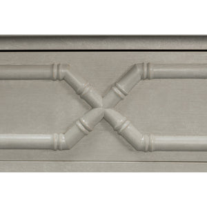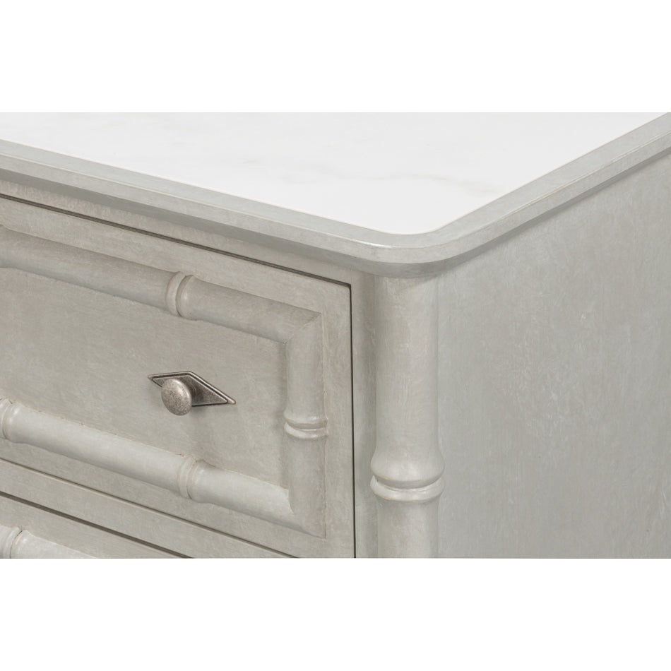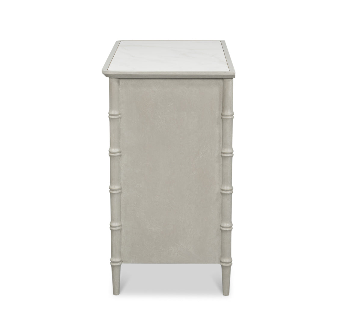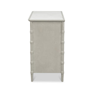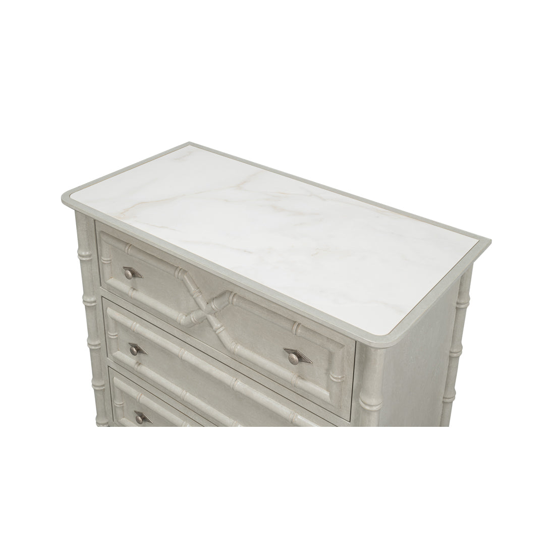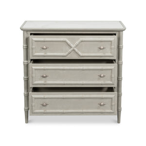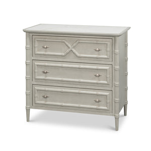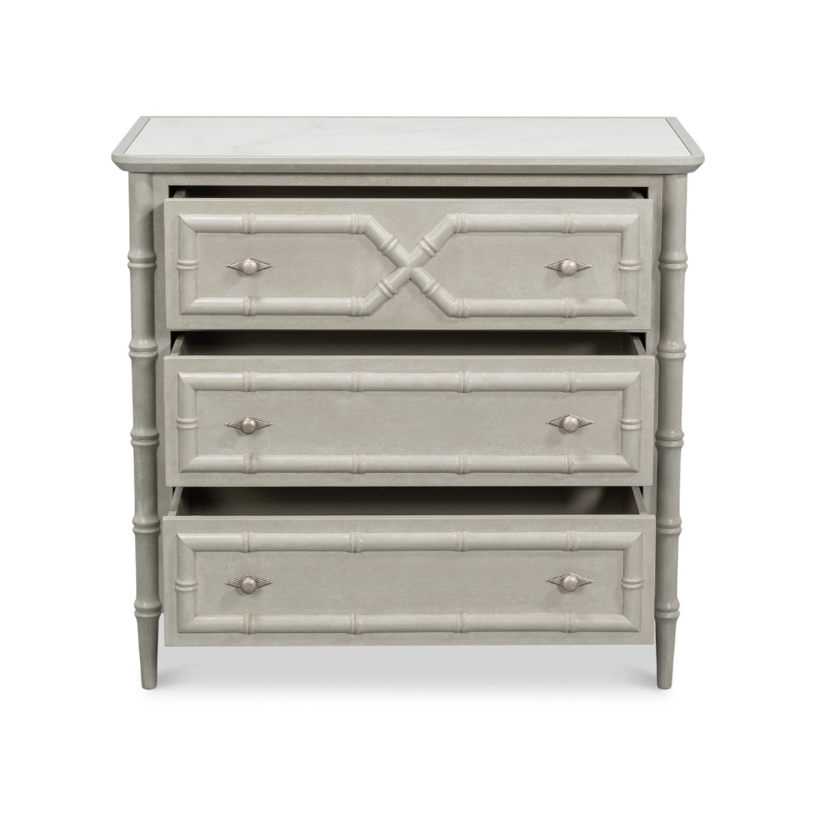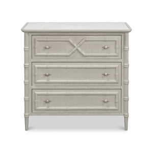 The Faux Bamboo 3-Drawer Chest blends timeless elegance with coastal-inspired design. Crafted with raised bamboo-style moldings and tapered legs, this piece showcases an Italian Grigio painted finish complemented by antique pewter hardware. A crisp white porcelain top provides a refined contrast, enhancing its sophisticated tone.