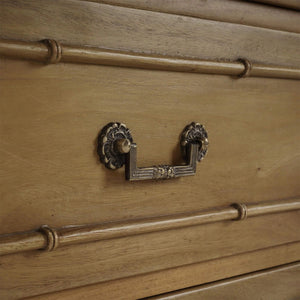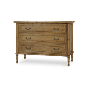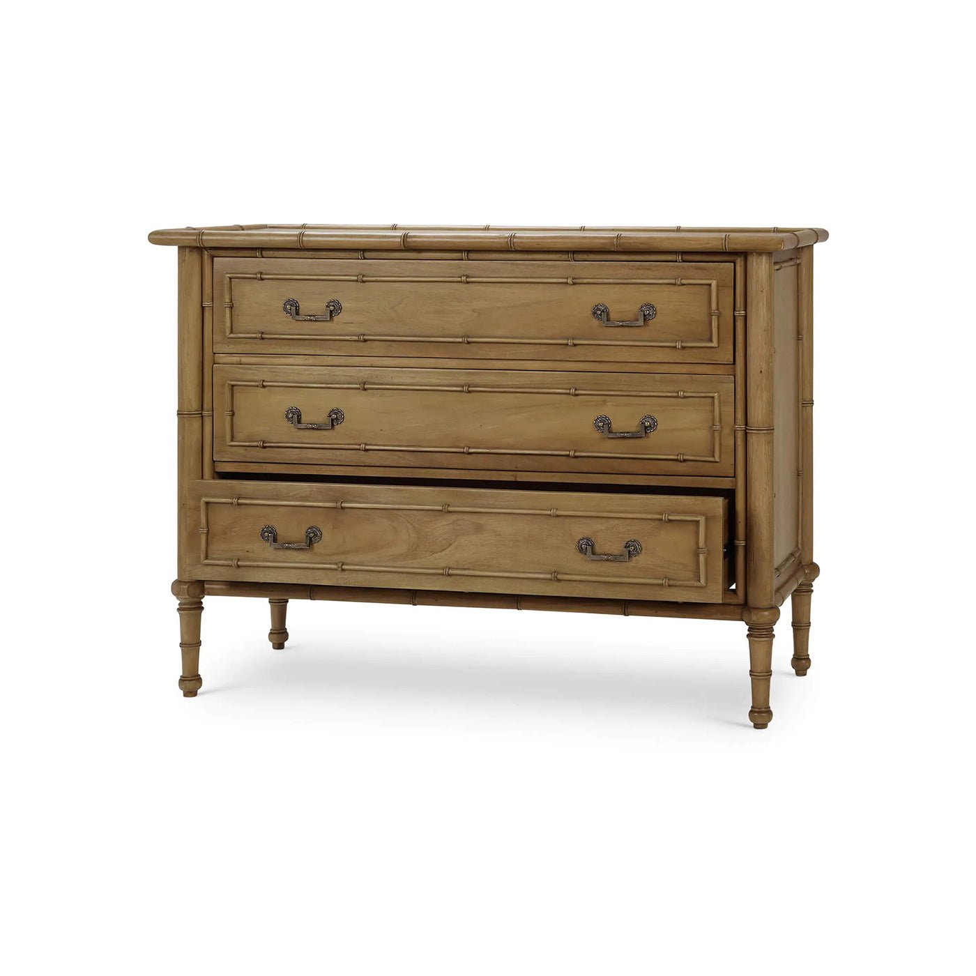 The Faux Bamboo Three Drawer Chest offers a fresh take on British Colonial style, blending sculpted details with a warm, aged finish. Made from mahogany with an Antique French Oak look, it features a carved faux bamboo frame and turned legs that bring to mind the easy elegance of tropical and Anglo-Indian homes. The wood’s natural warmth highlights the bamboo-inspired texture, giving the chest a timeless, heirloom quality.