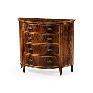 The Georgian Mahogany Demilune Chest of Drawers in the George III Hepplewhite style shows the elegance of late 18th-century design. Its curved front, balanced shape, and detailed decoration highlight its classic look. The demilune shape gives the piece a softer outline, and the mahogany veneers are matched to create a symmetrical, flame-like pattern that stands out on the front and top.