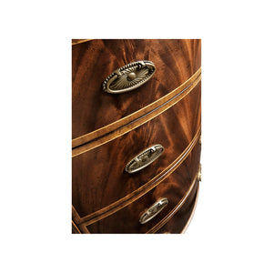 The chest has four drawers, each outlined with fine string inlay and crossbanding, showing the careful craftsmanship of Hepplewhite and Sheraton styles. Oval brass pulls add a classic touch, and the tapered legs give the piece a light, elegant look. This chest is perfect for bedrooms, hallways, or formal living rooms, offering stylish storage inspired by English Neoclassical tradition.