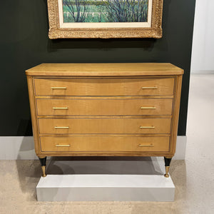 Resting on round tapered legs, this commode exudes mid-century charm with a classic edge. Whether placed in a bedroom, living room, or entryway, this piece enhances any space with its understated luxury and impeccable craftsmanship.
