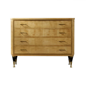 The sleek four-drawer design ensures ample storage while maintaining a streamlined, elegant aesthetic. Solid brass hardware and trim adds a refined touch, perfectly complementing the warm, golden hues of the sycamore veneer.