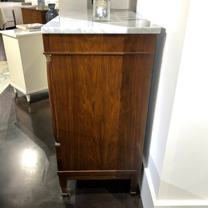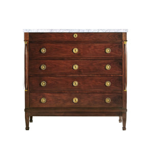 The Tall Empire Chest of Drawers showcases Empire-style grandeur with walnut veneer and solid brass accents. Its classic white marble top adds a luxurious touch, making it a striking focal point.