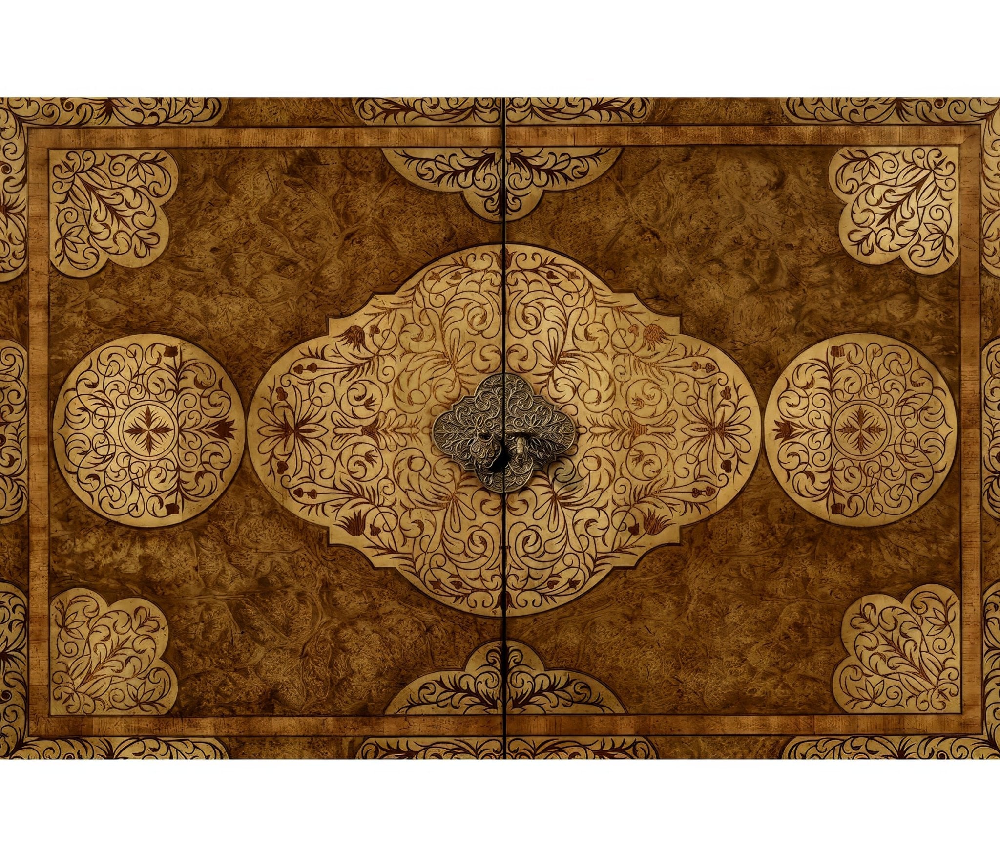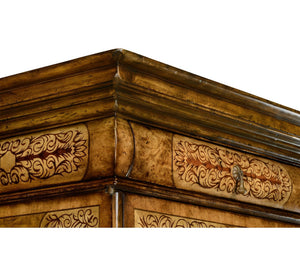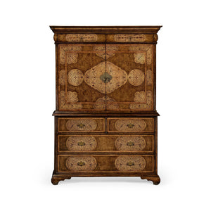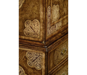 The lower chest has two short drawers above two long ones, each decorated with more inlay and finished with cast brass hardware made using the lost wax method. A strong cornice tops the cabinet, and bracket feet give it a stable, balanced look. The lined interior, built-in slide, and multiple storage options show both elegance and practical design. This cabinet is meant to be a centerpiece in studies, libraries, or formal rooms, and it captures the grandeur and skill of the William and Mary era.