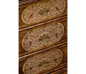The William & Mary Marquetry Cabinet on Chest stands out as a striking example of English Baroque design, with its bold shape and detailed decoration. Made from walnut and burl walnut, the upper cabinet opens with two doors to show a carefully arranged set of small drawers around a central cupboard, which was often used for storing documents or valuables. The front features intricate inlaid panels with swirling seaweed marquetry, adding depth and movement that reflect the style of late 17th-century English furniture.