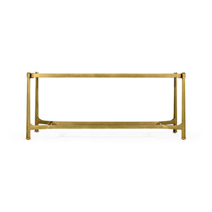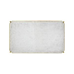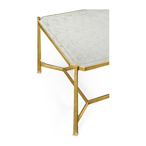 Art Deco Style Gilt Cocktail Table, wrought iron frame with an antique gilded finish and églomisé rectangular top set on an openwork stretcher base.