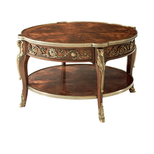 A French Louis XV style mahogany cross-banded banded cocktail table applied with very fine brass mounts, the brass bound circular top with protruding corners, the frieze with two opposing drawers, on ram's head capital cabriole legs joined by an undertier.