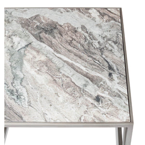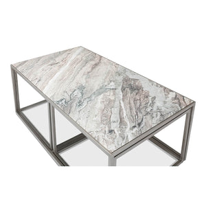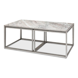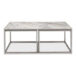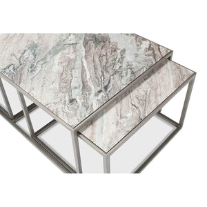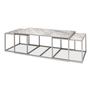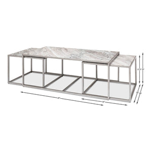 Modern marble 3 piece coffee table set. An elegant marble top sits on a metal base in an antique silver finish. The classic nesting table design includes a longer coffee table with two smaller tables that can slide in and out of the frame.