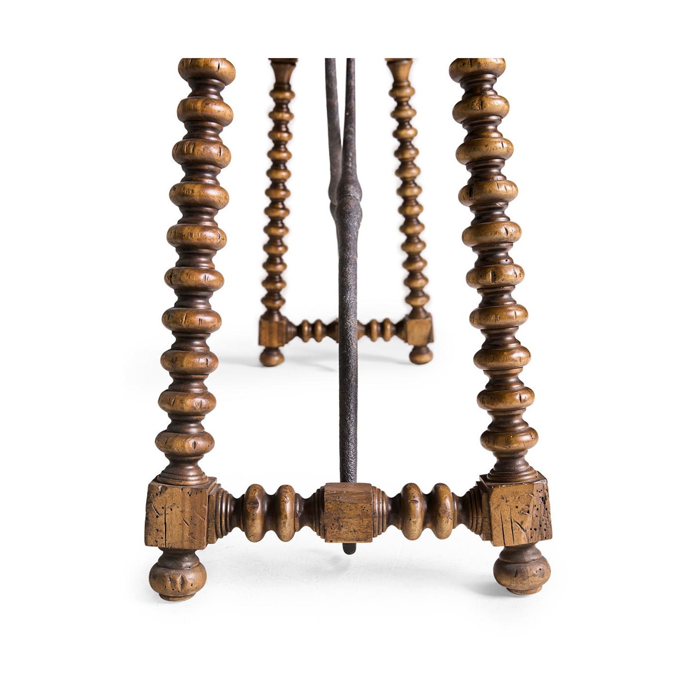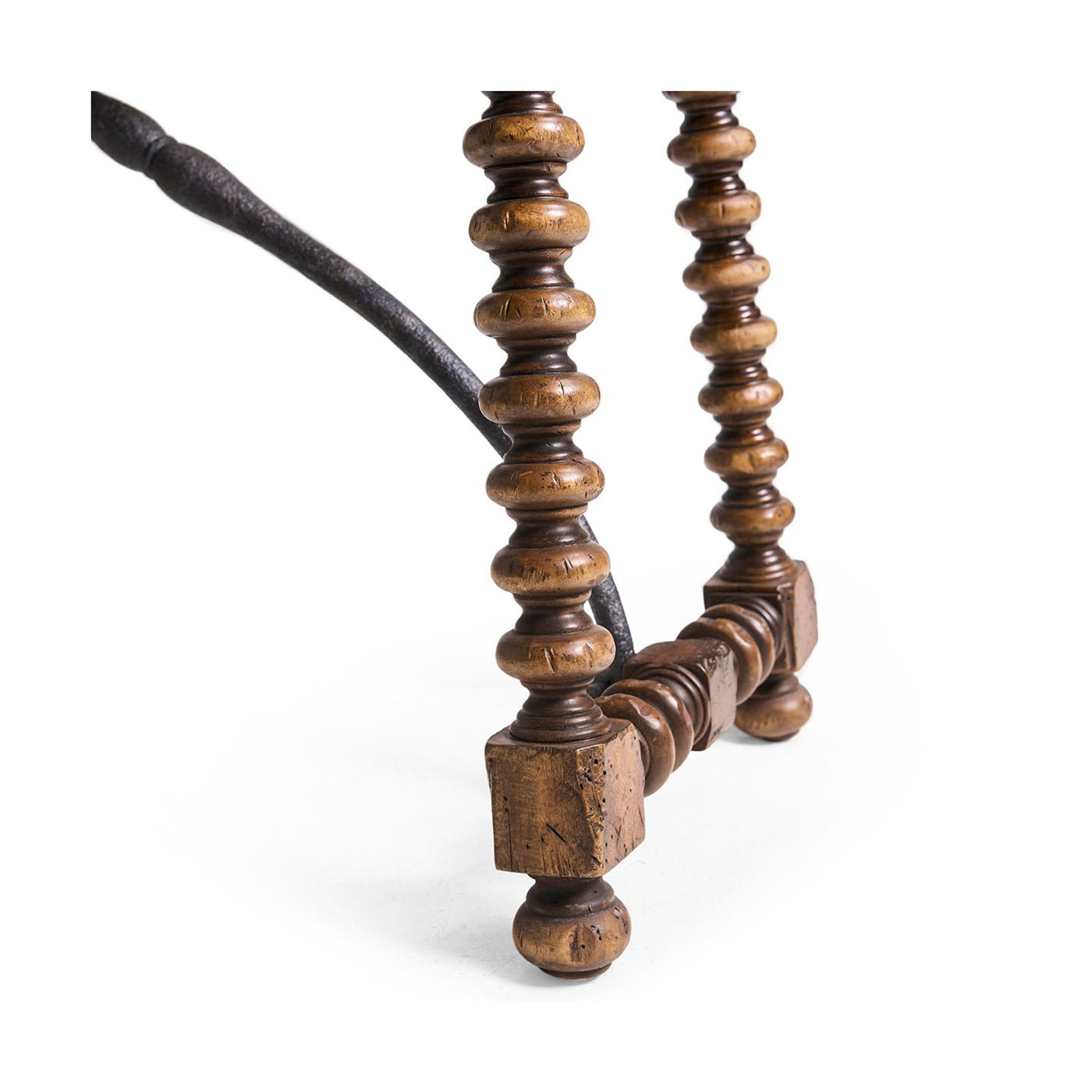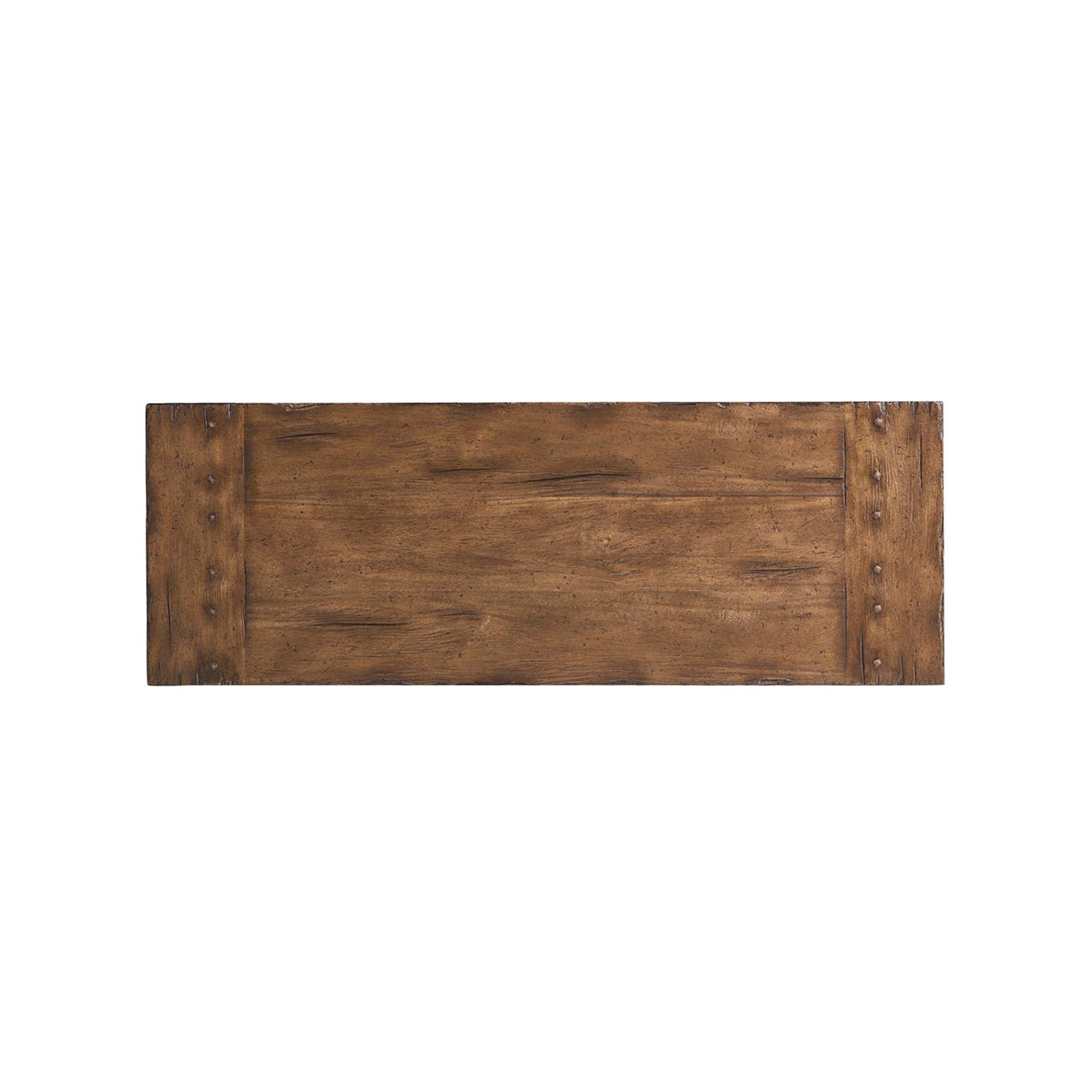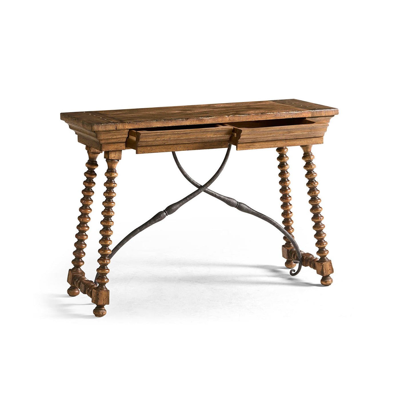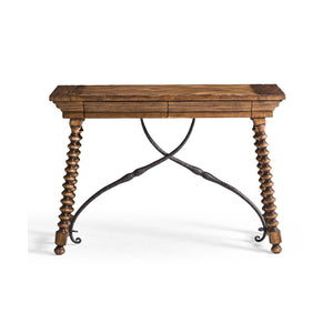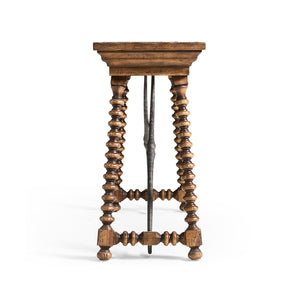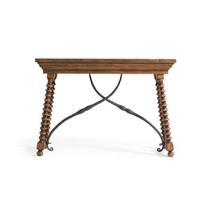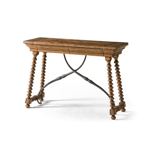 A curved, hand-forged iron stretcher adds strength to the table and highlights its Spanish Colonial Revival style, while also standing out against the warm wood. Soft-close drawers are hidden in the apron, giving you a place to store everyday items out of sight. With its rustic texture, handcrafted metalwork, and useful features, this console table brings classic farmhouse style and lasting versatility to your home.
