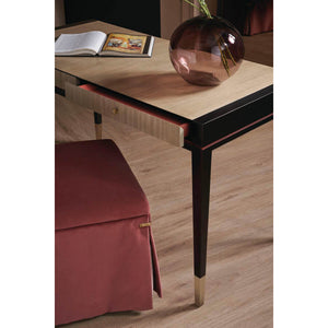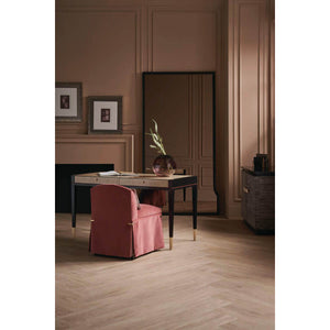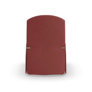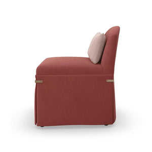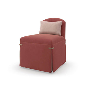 Petite Upholstered Accent Chair, this petite seat calls to mind the exquisite detail and drape of a bustle dress, fashionable during the late 1880s. Its elegant silhouette features a low camelback and dressmaker skirt in a dusty rose fabric, cinched together by textured metal brackets in Brushed Gold for a jewelry-like finish. Perfectly scaled to accompany a dressing table or vanity.